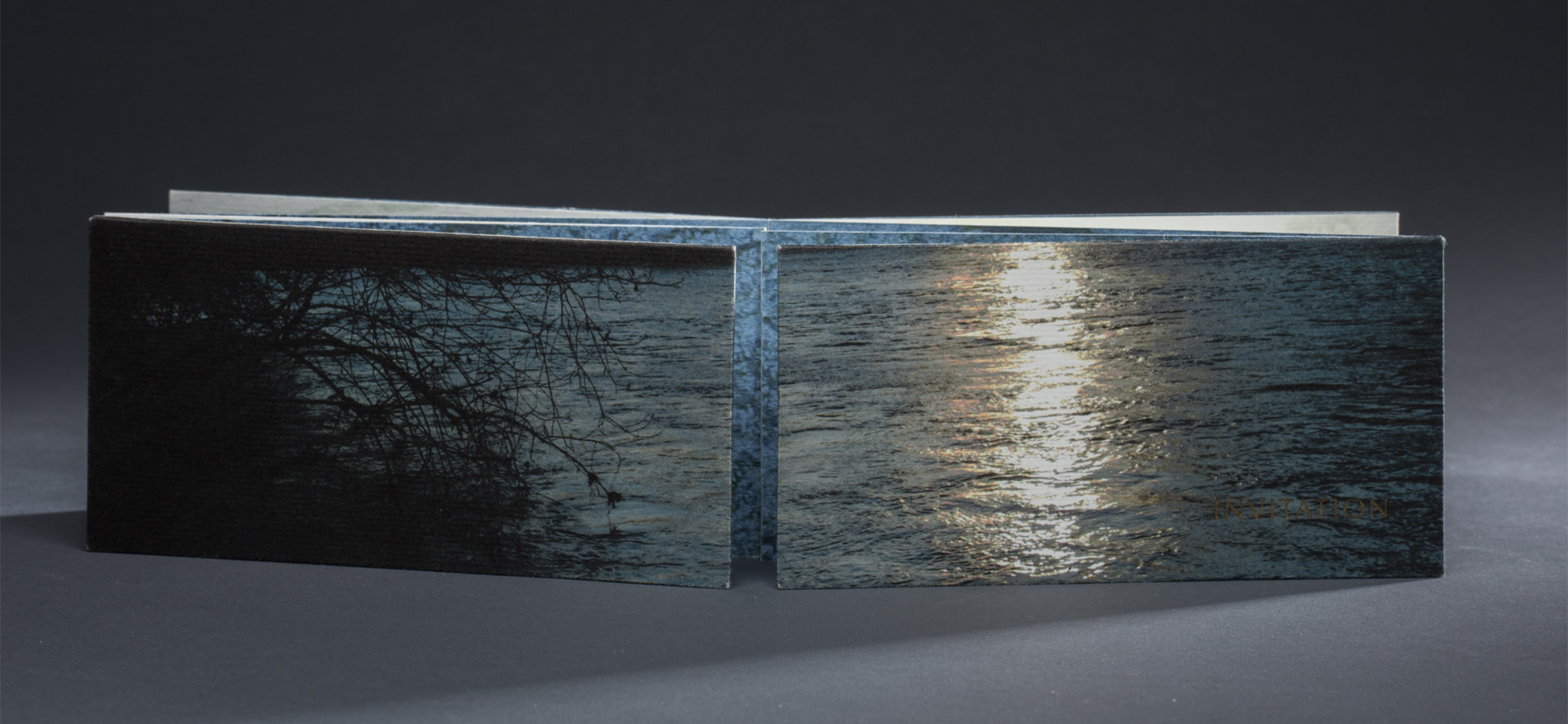 “Invitation” by Patrick Tilcock, © 2013 was designed, printed and bound by Sandy Tilcock. Computer-set Optima types were printed from polymer plates on Zerkall Earth Ingres paper using lone goose press’s Vandercook 219 proofing press. The backing paper used to form the concertina is St. Armand Canal, Blue Denim. The imagery for the poem and backing paper was derived from photos taken by Patrick on his daily bicycle commute to work, and were printed with an Epson 4880 inkjet printer.