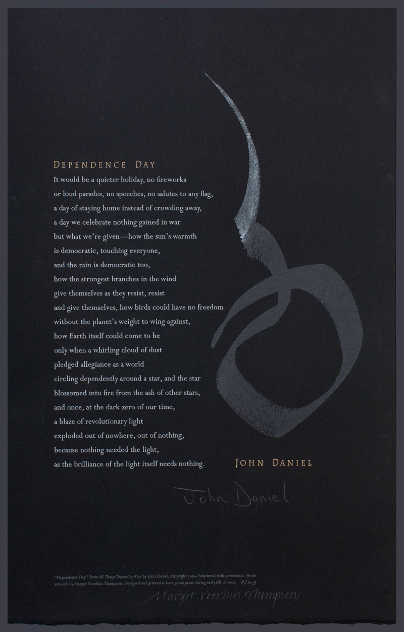 Printed on black Somerset Velvet paper. The text type is handset Perpetua with the display type Charlemagne and printed from a polymer plate. Both the type and graphic were printed on a Vandercook 219 proofing press. The top of the graphic was brushed with silver pearl dry pigment as it came off the press.