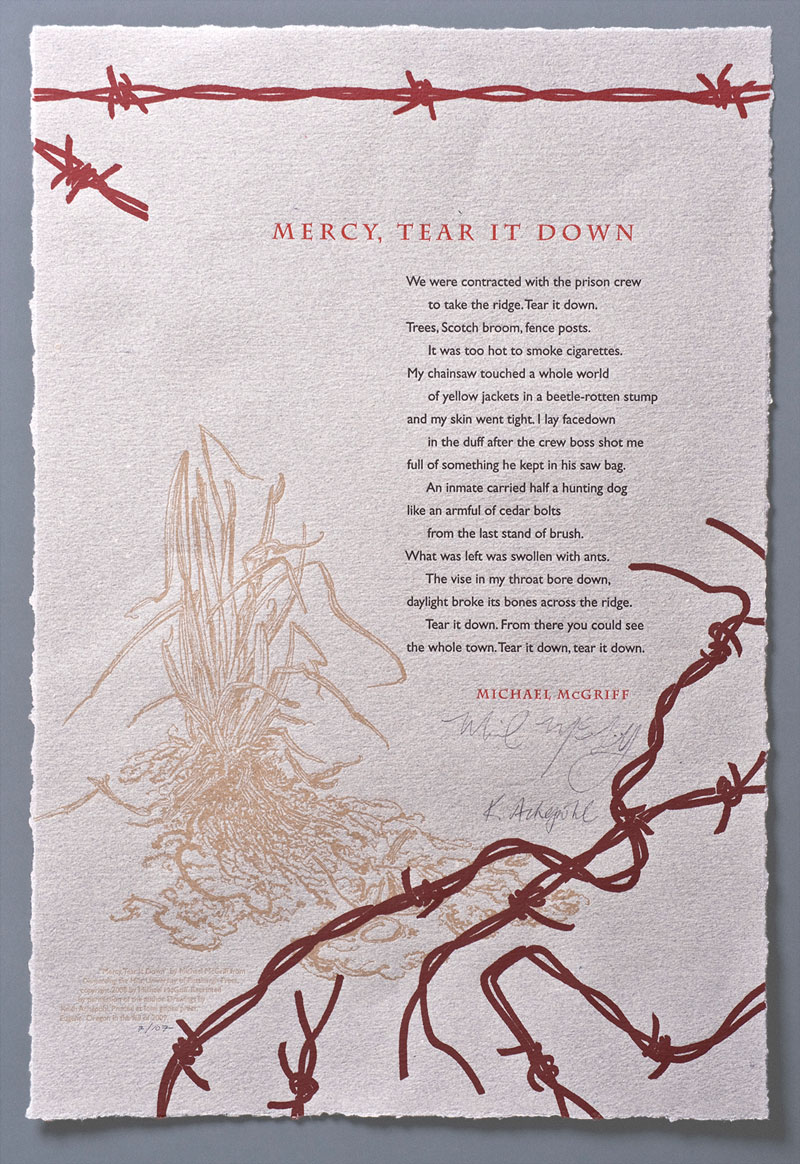 The paper is Canal Slate Gray, from the Saint-Armand mill in Montreal, Québec, Canada and is made using a variety of recycled fibers. The text type is Gill Sans and the display type is Charlemagne Bold. Both the type and images are printed from polymer plates on a Vandercook 219 proofing press.