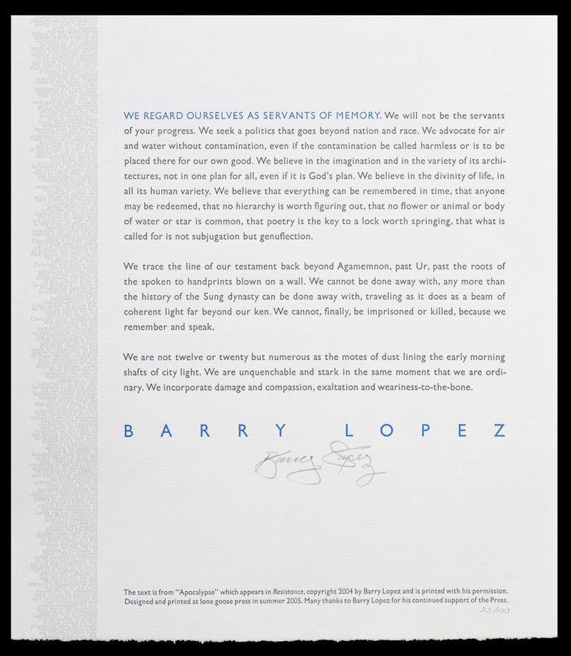 We regard ourselves as servants of memory. We will not be the servants of your progress. We seek a politics that goes beyond nation and race. We advocate for air and water without contamination, even if the contamination be called harmless or is to be placed there for our own good. We believe in the imagination and in the variety of its architectures, not in one plan for all, even if it is God’s plan. We believe in the divinity of life, in all its human variety. We believe that everything can be remembered in time, that anyone may be redeemed, that no hierarchy is worth figuring out, that no flower or animal or body of water or star is common, that poetry is the key to a lock worth springing, that what is called for is not subjugation but genuflection.