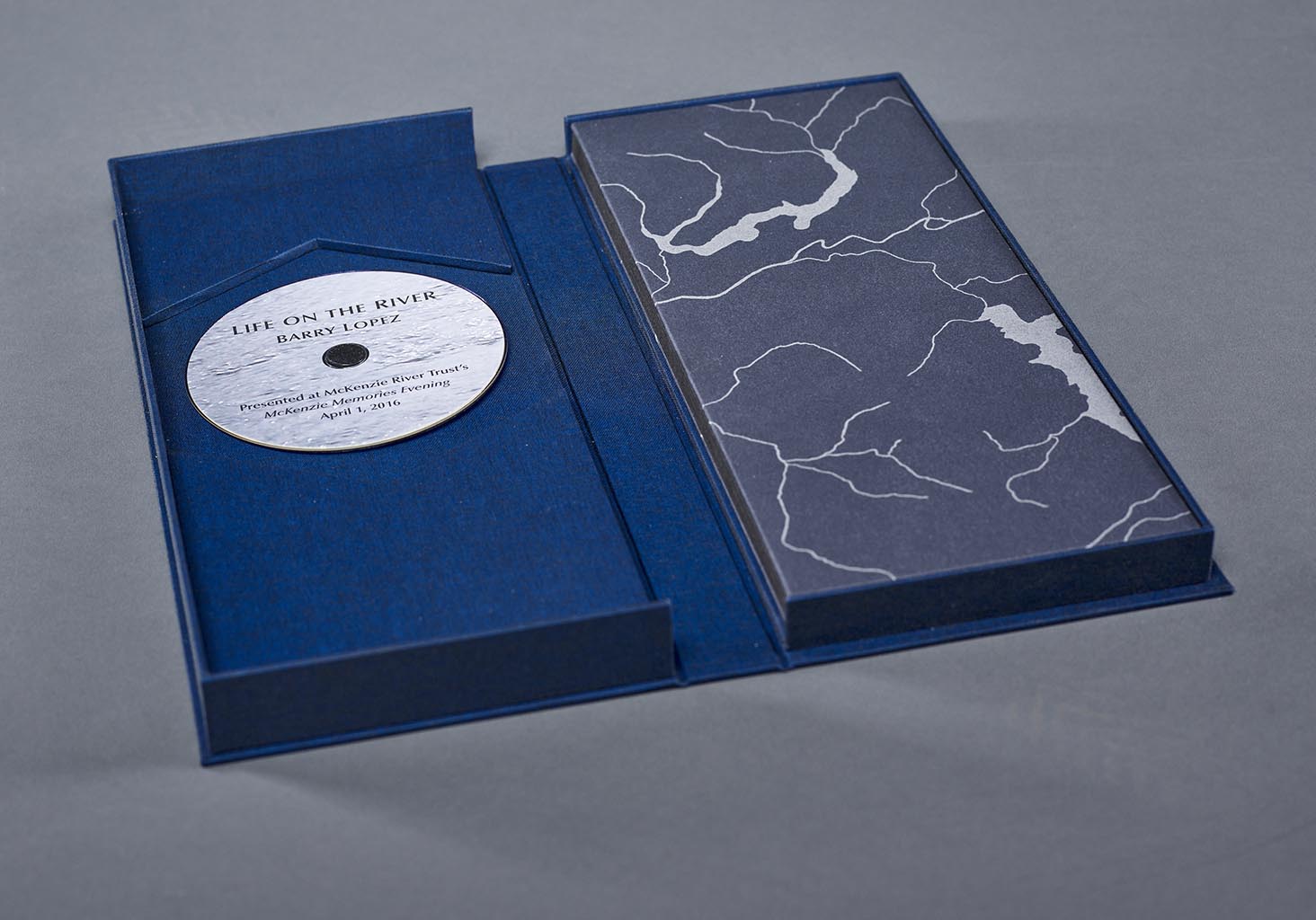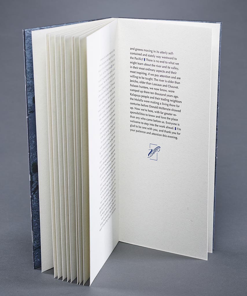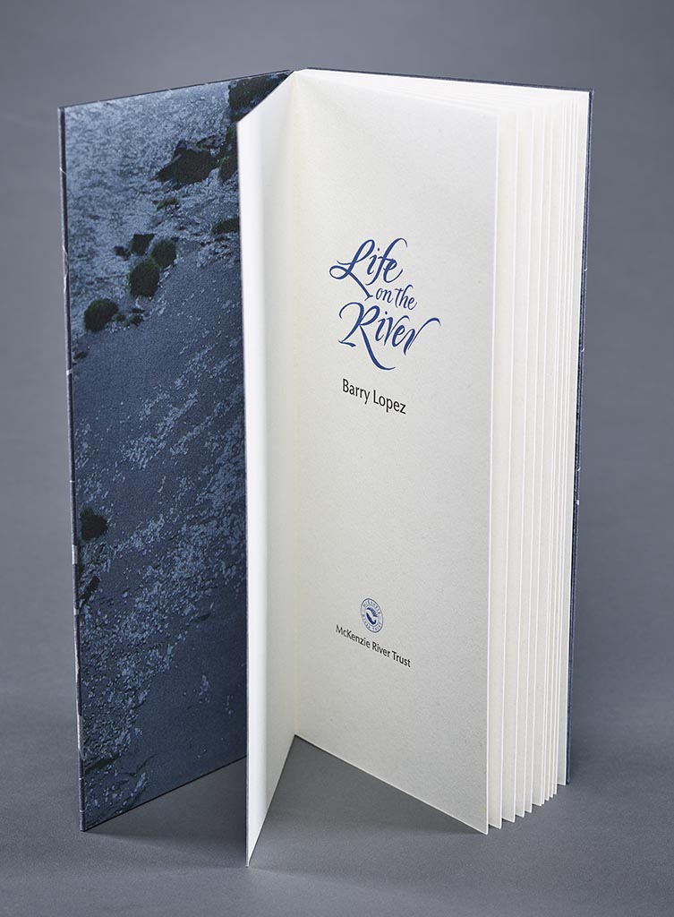 After the evening there were many requests for the McKenzie River Trust to publish the speech as an essay titled “Life on the River.” When a generous donor provided the funding, Trust leadership decided to publish a small chapbook and make it available to the public for a small cost. I was asked to design the chapbook. I donated my services as designer and hand-sewed 500 chapbooks.