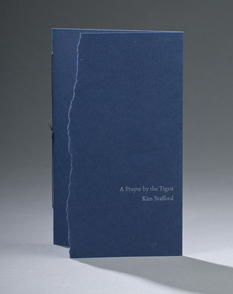 Single folio pamphlet sewn to a paper tri-fold cover made of Canson Mi-Teintes. The right fold of the cover sits on top and is torn. The edge of the tear was colored using a silver Prismacolor pencil. Handset Bembo types on mulberry paper.