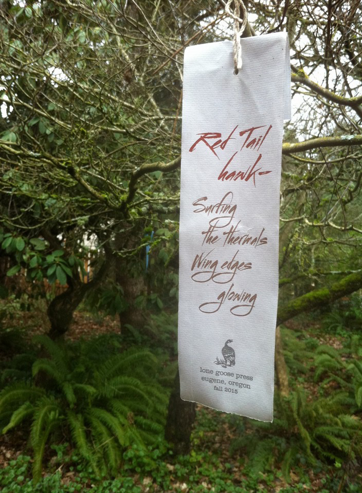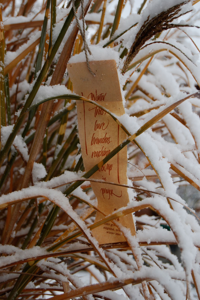 Calligrapher and teacher Lloyd Reynolds developed the practice of “Weathergrams” in the early 1970s. It relates to a Japanese tradition of short informal poems exchanged among friends. A weathergram is a poem of ten words or less written on a strip of paper, then hung outdoors on a branch or bough to weather over a season, between solstice and equinox, or equinox to solstice. The poems are simple, spontaneous, and often refer to aspects of nature or the season.