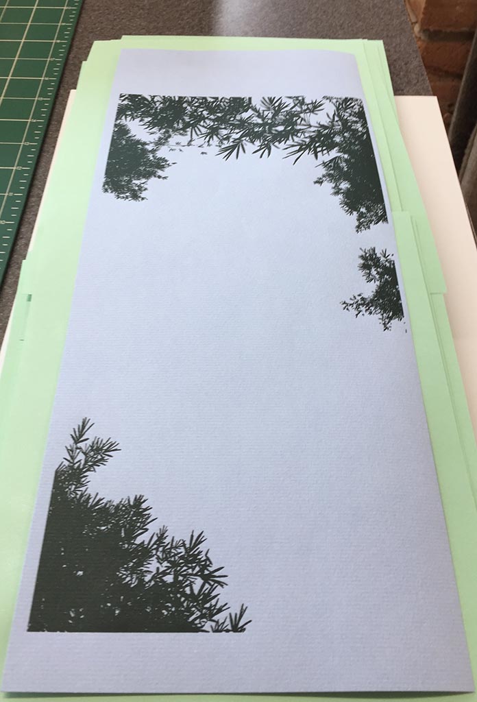 Press run 1: The trees printed in green on light blue Hahnemühle Bugra paper.