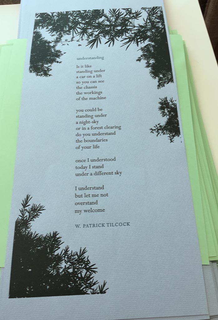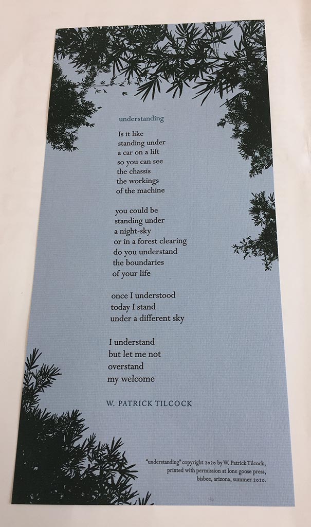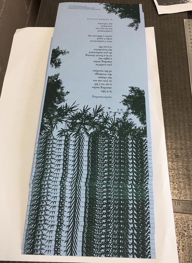 Right now my focus is to produce works that are smaller in scope, less complex and less expensive. To that end I asked Patrick to share some of his work with me to consider for a small broadside. After reading through the options, “understanding” jumped out at me. As is often the case with poetry there is an immediate interpretation, and once one starts working with the text there are many subtleties revealed.